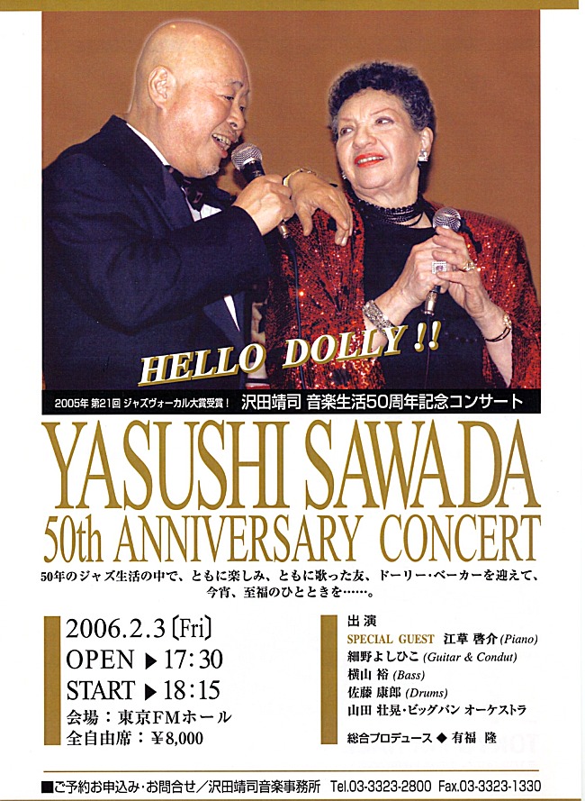 ドリー・ベーカーが4年ぶりに帰ってきました。 沢田靖司がちょうど「日本ジャズボーカル大賞」を受賞した記念と自らの音楽生活50周年を祝ってコンサートを計画していました。 そのコンサートにドリー・ベーカーを招待したのです。 もう、日本に帰るのは無理だと誰もが思っていたのですが元気に帰ってきました。 ドリーのファンには、もう生では聴けないと思っていた歌を聴く事ができるのです。皆、大喜びです。ドリーは聴く者に感動を与えてくれました。 東京FMホールは予定した人数をオーバーし客席の並べ方を変えたくらいです。 |