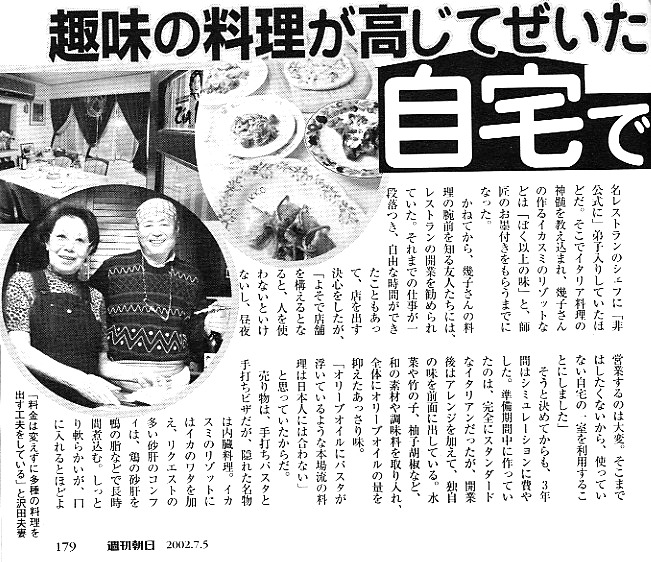 ついに、週刊朝日に取り上げられて紹介されました。どうです?本格的だということがお分かりだと思います。 ごらんのように沢田靖司自身も料理が上手で、親しい友人を招いては夫婦で家庭料理を作っては遊んでいたのが嵩じてしまったのです。 |