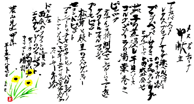 しばらく沢田家のディナーにはありついていなかったのですが、久しぶりに珍しいものばかり食べさせてもらいました。贅沢な材料しか使いません。ちなみに今夜のメニューは豪華版です。 |