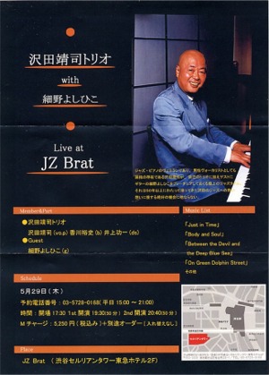 久方ぶりの「沢田靖司の弾き語り」ライブでした。多くの人たちの待望のライブだったのではないでしょうか。 共演のギターの名人、細野よしひこも久しぶりのセッションに興奮していました。聴いているわれわれも、同じ思いを共有していました。 JZ Bratで満席で予約お断り、キャンセル待ちなんて私は初めてでした。細野よしひこが席をとっておいてくれました。それでなかったら行きそびれていたところです。 「満席で行かれません」という電話が、私のところにも何人も入ってきました。何とか成るものなら入れてあげたいのですが、仕方がありません。 左のフライヤーの写真は、今はなくなってしまったレストラン「リビアン」の2階のラウンジでのものです。 90年代の中頃にこのレストランが溜池で開業しました。オーナーは「タニッチョ」という、私の6歳のときからの同級生です。沢田とはテニス友達なのです。 |
