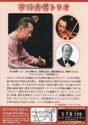 2012年の幕開けはこのライブから 2012年2月16日(水) 六本木 STB 139 昨年11月病床にあった沢田に市川秀男から「一緒にやろう」と誘いがかかった。バイパス手術をする前だというのに。 市川さんから「2月なら大丈夫だよ」と言われ、沢チンは引き受けてしまいました。 幸い手術も成功、暮から新年はゆっくり休養しています。 今日、このフライヤーが沢田家から届きました。 皆で全快祝いに行こう!! 早く予約しないとSold Outになってしまいます! |